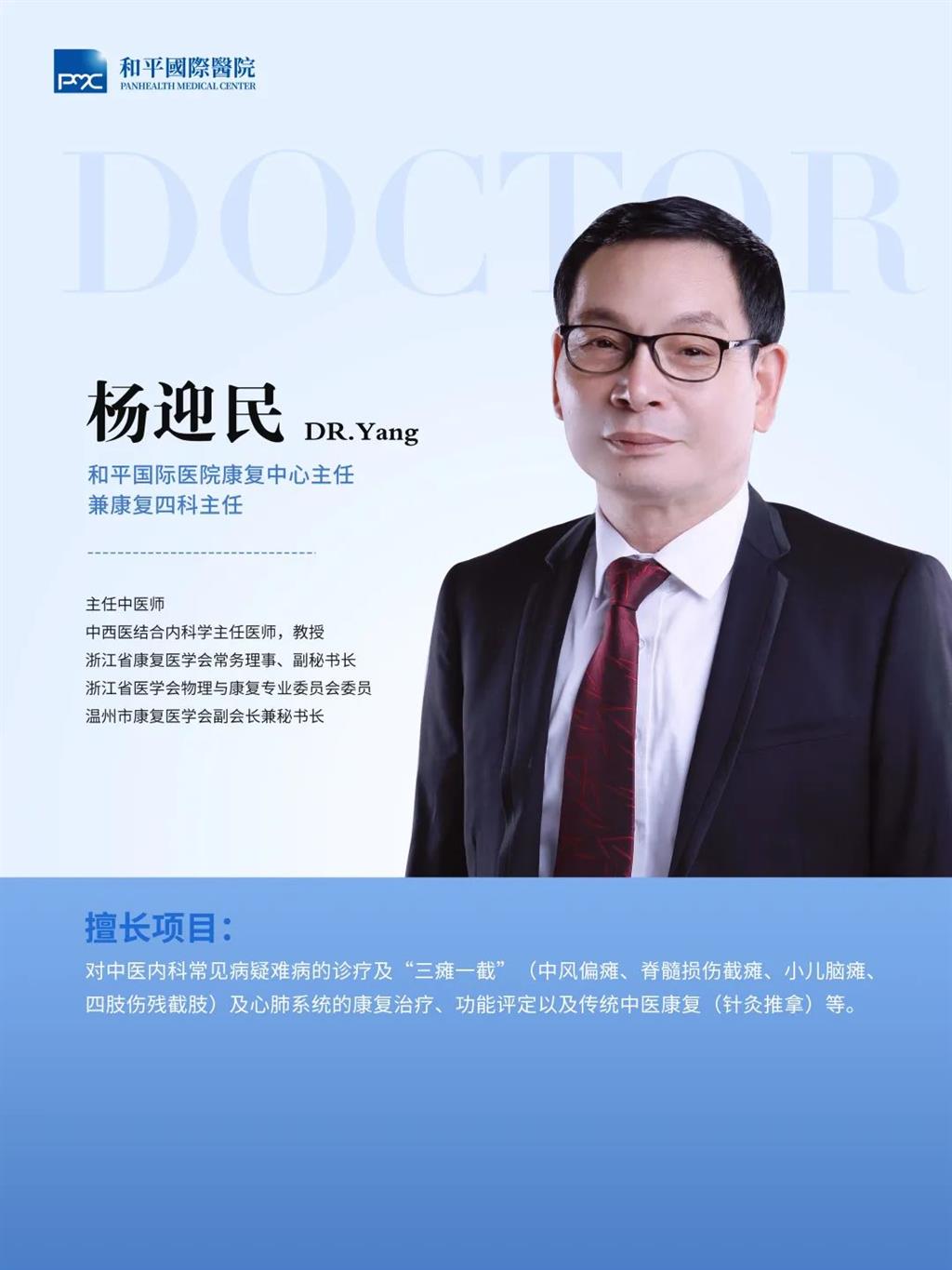 作为和平国际医院中医康复的带头人,杨迎民自创“肌电生物反馈电刺激配合中药熏洗法”,中西医互补治疗脑卒中患者肢体功能障碍,有效率高达88.49%;主持多项省级科研项目,包括“益气补肾汤联合高压氧治疗狼疮性脑病”“补气祛瘀汤配合中药离子导入对卒中患者运动功能的疗效评价与影响”等,聚焦中西医结合康复技术的优化与创新,在临床治疗中都得到了良好反馈。此外,他还与编写《新编康复治疗学及应用》《康复医学理论与实践》《传统中医诊断治疗学》等专著,先后在国家级省级医学杂志发表论文30多篇,获得了浙江省“康复三十年突出贡献奖”、温州市先进科技工作者等荣誉称号。